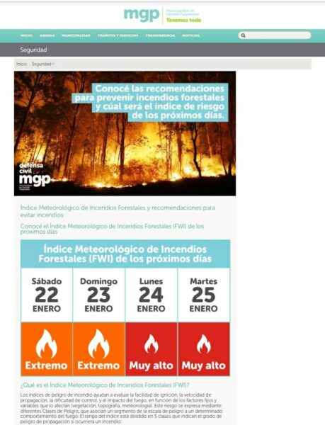 Toda la información acerca del Índice Meteorológico de Incendios Forestales y demás recomendaciones para evitar incendios forestales y de pastizales está disponible en el link http://mgp.gob.ar/incendiosforestales
