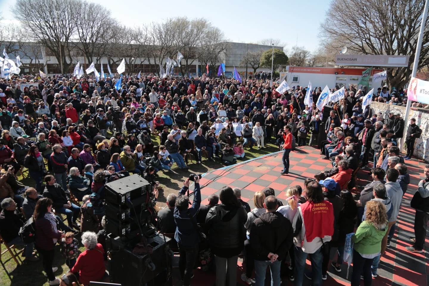 En la plaza de la revolución, de la escuela Piloto, más de 2000 personas se juntaron para compartir un acto del que fueron parte distintas organizaciones sociales, representantes del PJ local (muchos de los cuales tuvieron expresiones en el acto también), concejales, funcionarios locales y provinciales, y encabezado por Fernanda Raverta, quien es la referente del espacio.