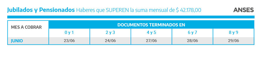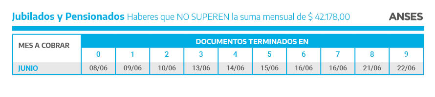 Las pensiones no contributivas comenzarán a cobrar según terminación de DNI desde el primer día del mes, las jubilaciones con haberes que no superen 37.524 pesos (sin contar el aguinaldo) lo harán el 8 de junio, y los haberes que superen los 37.524 pesos comenzarán a percibirlo desde el 23.