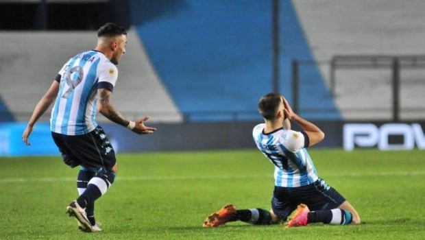 Racing Club venció esta noche de local por 1-0 a Sarmiento de Junín y alcanzó la cima del torneo de la Liga Profesional de Fútbol junto con su clásico rival, Independiente, ambos con ocho unidades, tras ponerse en marcha la cuarta jornada.