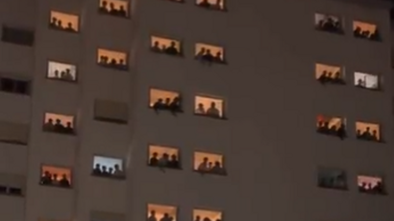 En el video filmado desde la residencia de estudiantes mujeres a la que iban dirigidos los mensajes, el Colegio Mayor Santa Mónica, puede verse un movimiento perfectamente sincronizado donde se abren las persianas de las ventanas de los otros dormitorios, por los que decenas de estudiantes se unen gritando.