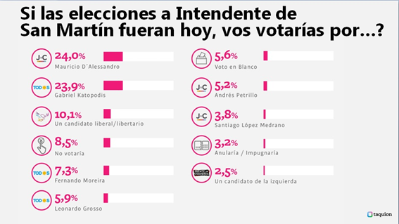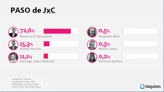 Tomamos como ejemplo la muestra que acaba de finalizar la consultora Taquion, que abarcó 1625 casos, y fue realizada entre el 25 y el 29 de marzo. Cuando se les pidió a los vecinos que optaran por uno de los posibles candidatos dentro de JxC, la ventaja del Dr. D´Alessandro fue abrumadora, y superó el 70 % de las preferencias. También figura a la cabeza de las preferencias, aunque con menos margen, cuando se consulta a los vecinos ofreciendo todas las opciones del universo político.