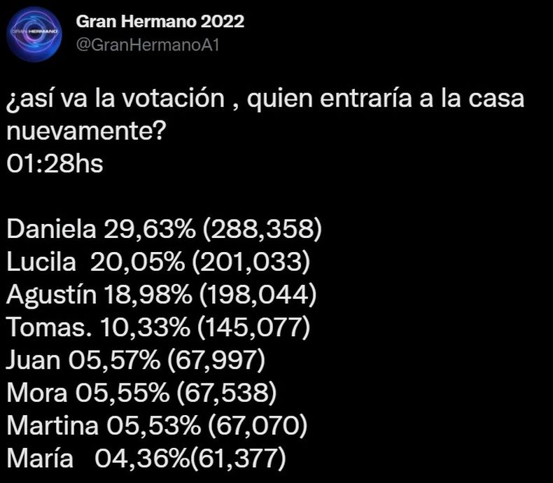 Según se informó en Twitter, las favoritas son mujeres y serían Daniela «Pestañela» Celis junto a Lucila «la Tora» Villar, ya que con esto se volvería a igualar la cantidad de chicos y chicas dentro de la casa de Gran Hermano. Por el lado de la última eliminada, ella tendría casi un 30% de los votos totales, mientras que la otra exparticipante superaría a Agustín «Frodo» Guardis por poco más de un 1%.