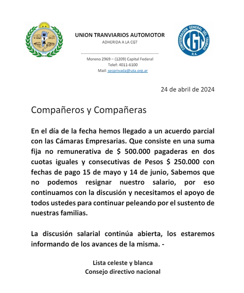 Se llegó a un acuerdo y no habrá paro de colectivos 24 de abril de 202424 de abril de 2024 REDACCIÓN La UTA anunció que alcanzó un acuerdo salarial con las cámaras empresariales. Tras más de 5 horas de reunión en la Secretaría de Trabajo, el UTA publicó un comunicado en el que anuncian que hubo un acuerdo parcial.