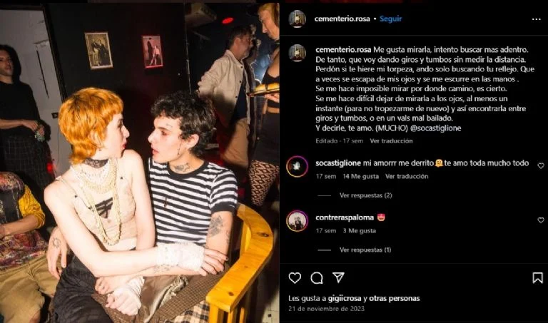 “Se me hace imposible mirar por dónde camino, es cierto. Se me hace difícil dejar de mirarla a los ojos, al menos un instante (para no tropezarme de nuevo) y así encontrarla entre giros y tumbos, o en un vals mal bailado. Y decirle, te amo. (MUCHO) @socastiglione», escribió él. Mientras ella respondió: «Mi amorrr me derrito. Te amo toda mucho todo».