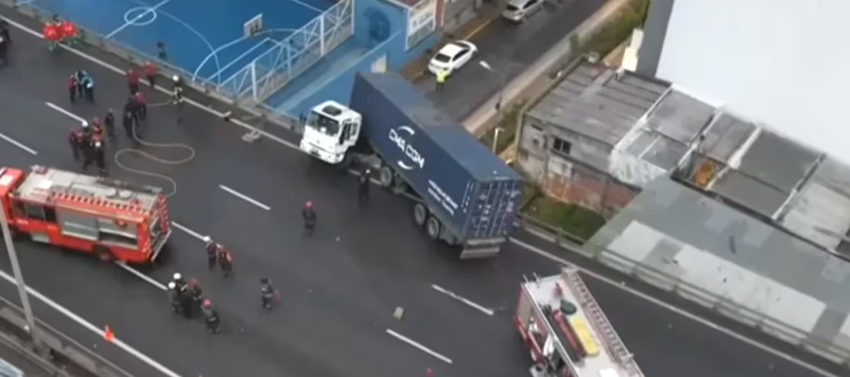 Un camión quedó colgado este martes de la autopista 25 de Mayo tras un choque. El incidente vial ocurrió sobre la autovía a la altura de la calle Perú, donde se montó un importante operativo del SAME y Bomberos de la Ciudad.