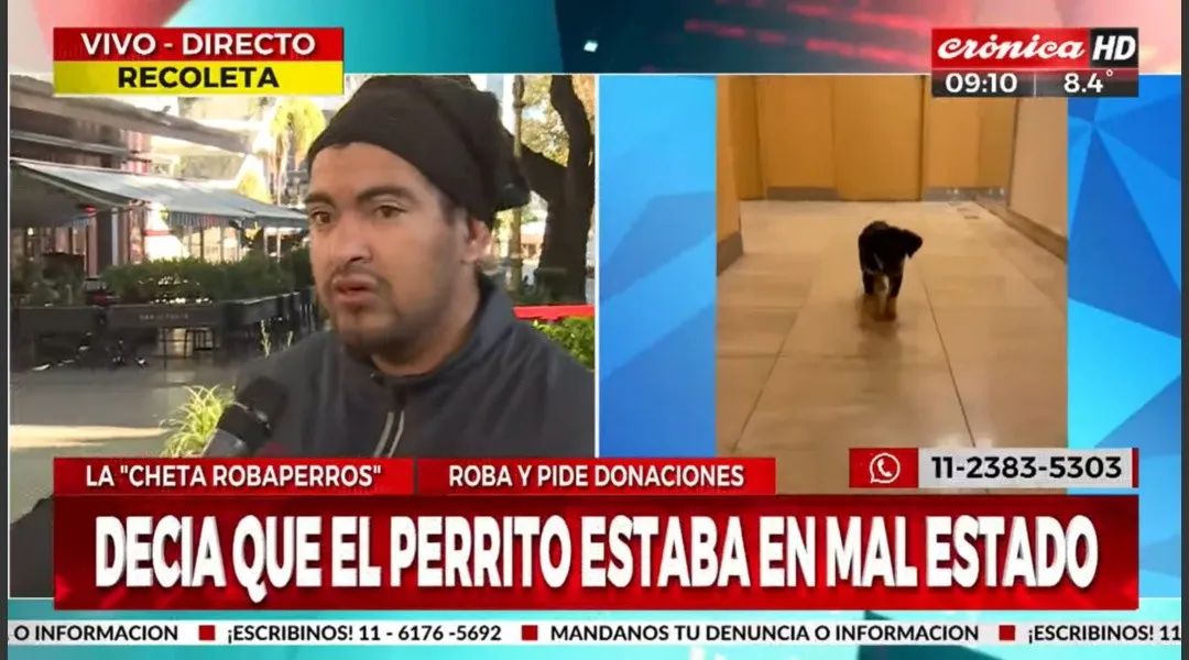 Agustín, el dueño del perro robado este domingo en Palermo, dialogó en exclusiva con Crónica y reclamó que la joven se lo devolvió: “Estoy en situación de calle, pero lo cuido mucho”, declaró. Florencia es una vecina de recoleta que se volvió viral en las redes luego de contar cómo le robó el perro de un hombre en situación de calle porque vio como lo maltrataba . Para profundizar en el caso, el equipo de Crónica HD se acercó al lugar de los hechos y encontró una entrevista exclusiva con Agustín. “Otros chetos me ofrecieron plata…