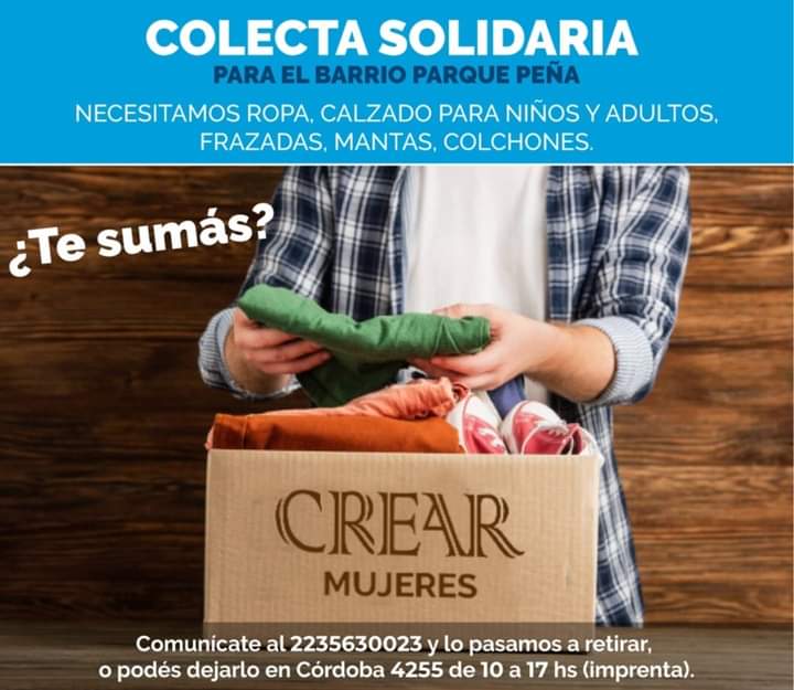 Desde Mujeres Crear se comenzó a compartir una iniciativa para ayudar a las familias más necesitadas del barrio Parque Peña, el contexto ya conocido por todos, sumado a la llegada del frío, agravó enormemente su situación. En esta oportunidad están solicitando ropa y calzado para niños y niñas desde los 3 años hasta los 14 , ropa de adulto hombre y mujer y sobre todo ropa de abrigo , mantas frazadas etc , colchones, y todo lo inherente al hogar , todo lo recaudado se entregará en mano, bajo responsabilidad directa…