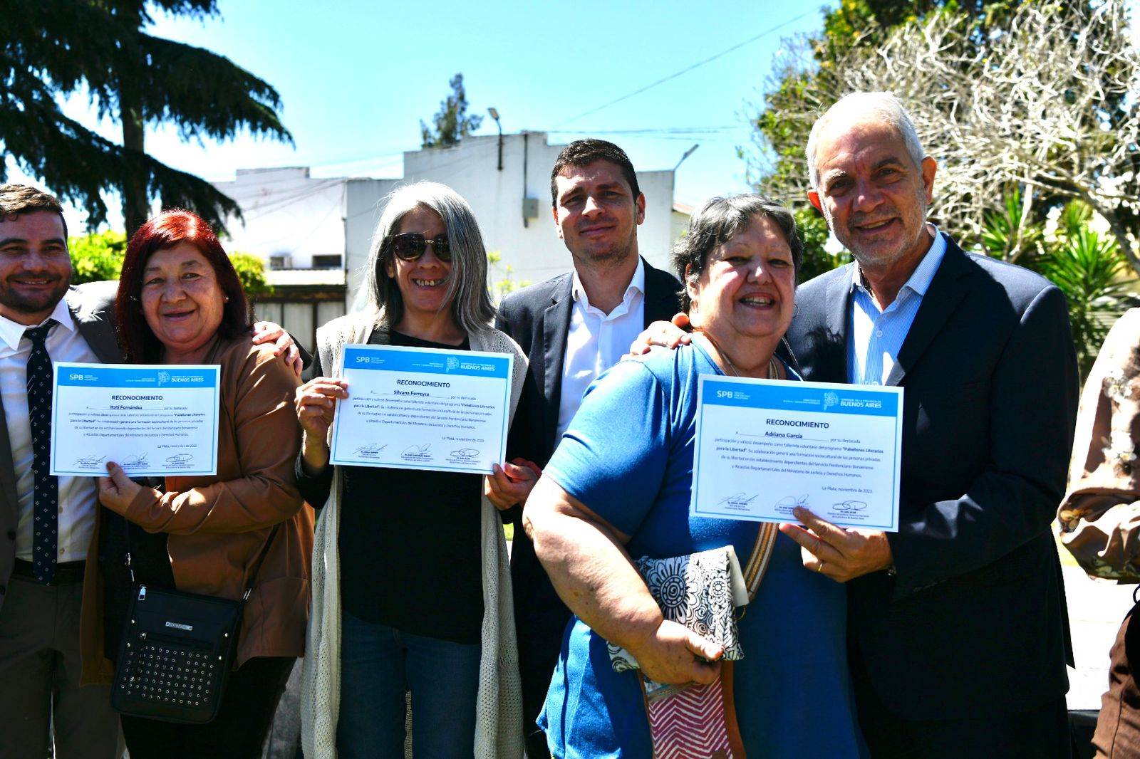 En una jornada cargada de emoción, en la jefatura del Servicio Penitenciario Bonaerense (SPB), reconocieron a 16 agentes de diferentes lugares de la Provincia que se desempeñan como talleristas del programa Pabellones Literarios Para la Libertad. Con la participación del subsecretario de Política Penitenciaria, José González Hueso, del jefe del SPB, Xavier Areses, y del ex titular de la Dirección Nacional de Apoyo al Liberado (DINALI) de Uruguay, Jaime Saavedra DellePiane, la asesora del Ministerio de Justicia y Derechos Humanos, Julia Lescano, junto a la jefa de departamento Cultura de…