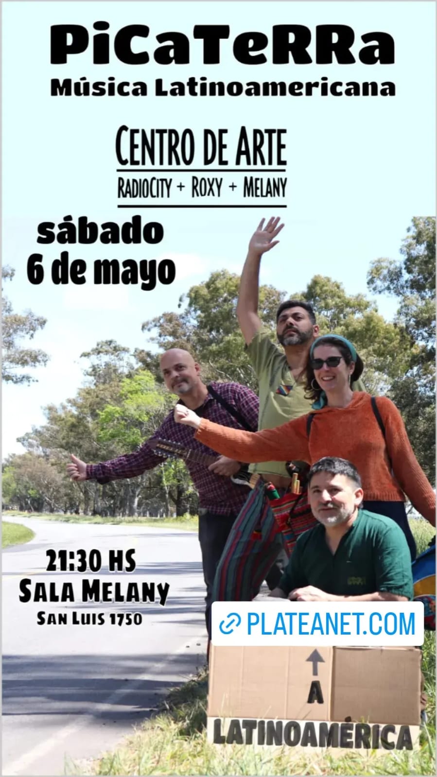 El grupo “PiCaTeRrA”, Música Latinoamericana, se presentará el día 6 Mayo en la sala Melany de centro de arte Roxi Radio City Melany.El espectáculo propone un recorrido por Latinoamérica a través de sus diferentes ritmos: Argentina, México, Brasil, Venezuela, Ecuador, Colombia son algunos de los países que se visitarán con el dinamismo que da la variedad de estilos, y la plasticidad del conjunto Picaterra. Los músicos van ocupando diferentes lugares en busca del sonido: Silvana Boldrini: Piano, cuatro y voz – Facundo Rodríguez: Voz y Piano – Marcelo Calderón: Percusión…