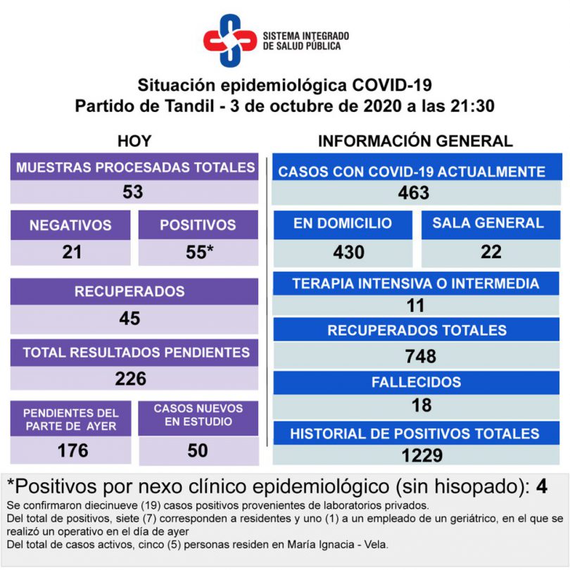 El Comité de Seguimiento informó que se contagiaron con Covid-19 los siete adultos mayores y un empleado de la residencia donde este viernes se realizó un operativo ante la aparición de tres casos. La cantidad de pacientes activos es de 463, de los cuales 430 cursan la enfermedad en sus domicilios, 22 están en sala general y 11 se encuentran en terapia intensiva o intermedia.