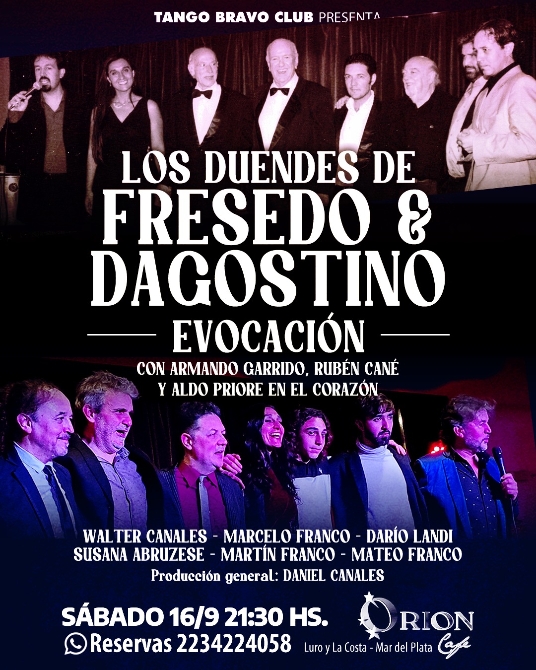 El Sábado 16 de Septiembre a las 21:30 hs el TANGO BRAVO CLUB se complace en presentar una noche de evocación, con LOS DUENDES DE FRESEDO & DAGOSTINO, el 1º espectáculo éxito del TBC cuando comenzó su ciclo hace más de veinte años. La cita es en Café Orión (Luro y la Costa) Mar del Plata. Reservas: 223 4 224058.