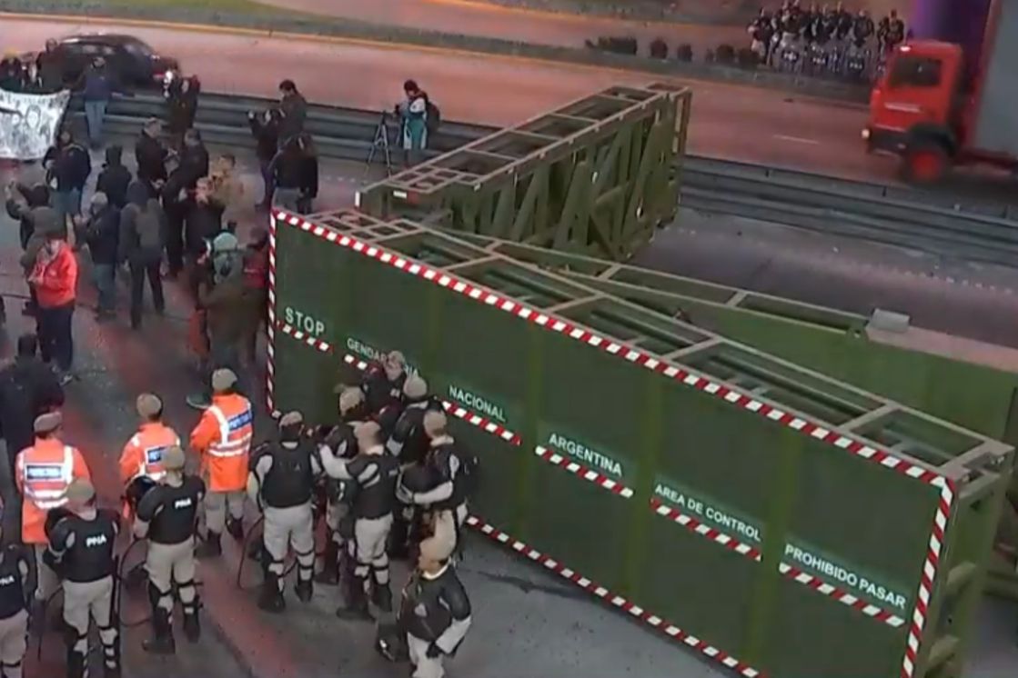 Trabajadores del MST-FIT Unidad realizaban esta mañana un corte en el Puente Pueyrredón en reclamo de «salarios dignos, trabajo y vacunas», en medio de un fuerte despliegue de efectivos de Prefectura que intentaron desalojar el lugar.