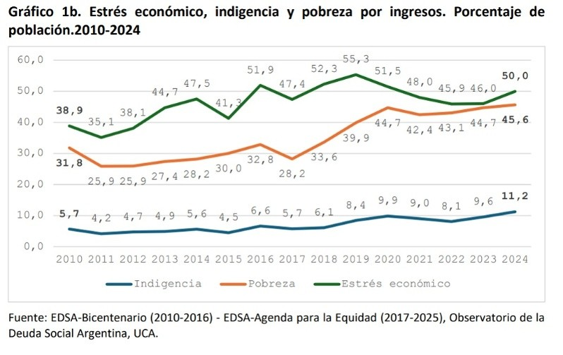 En cambio, durante el período 2019-2020 la pobreza por ingresos se incrementó del 31% al 35%, mientras que el estrés económico disminuyó. Desde 2022 aumentaron tanto la pobreza por ingresos como el estrés económico, aunque esta segunda tuvo un aumento más significativo. En síntesis, los autores del informe apuntaron que el estrés económico supera en todo el período a la pobreza por ingresos, con diferencias de 10 a 20 puntos porcentuales.