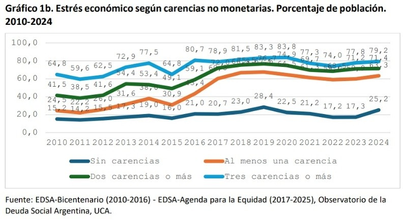 Las carencias no monetarias tienen en cuenta derechos como alimentación y salud, servicios básicos, vivienda digna, ambiente saludable, educación, empleo y seguridad social. “El indicador de estrés económico complejiza el análisis de las privaciones económicas al dar cuenta del modo en que los hogares experimentan sus restricciones, incluso si se ubican por encima de la línea de pobreza monetaria”, destaca el estudio.