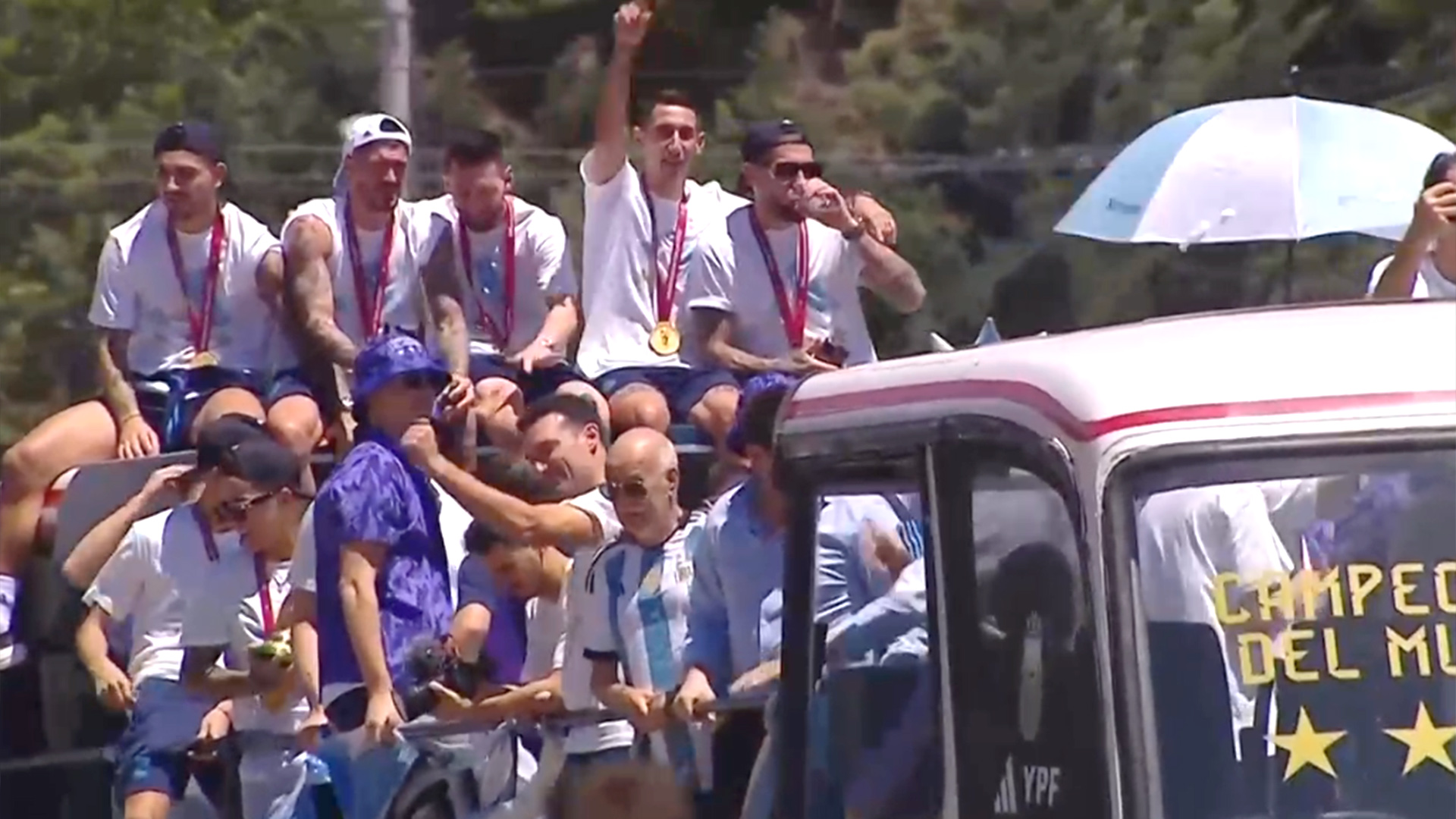Exhibiendo la Copa del Mundo, los jugadores y el director técnico Lionel Scaloni saludan y cantan a bordo de un micro descapotado con los miles de hinchas que se distribuyen por la autopista Riccheri, en medio de un amplio operativo de seguridad.