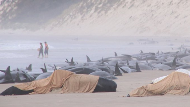 Alrededor de 200 ballenas piloto murieron tras quedar varadas en una playa barrida por las olas en la abrupta costa del oeste de Tasmania, en Australia, indicó un equipo de rescate de ese país.