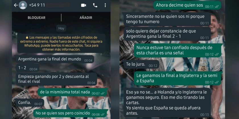 El presagioso mensaje que se muestra en las capturas del chat detalla que “La Scaloneta” llegará al séptimo partido del 18 de diciembre en el Estadio Lusail. “Argentina gana la final del mundo 1-2. Empieza ganando por 2 y descuenta al final el rival”, asegura el profeta.
