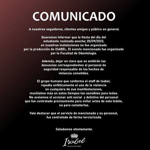 Tras la viralización del video, el local bailable emitió un comunicado. Allí asegura que el personal de seguridad era tercerizado y que “se emitirán las denuncias correspondientes”.