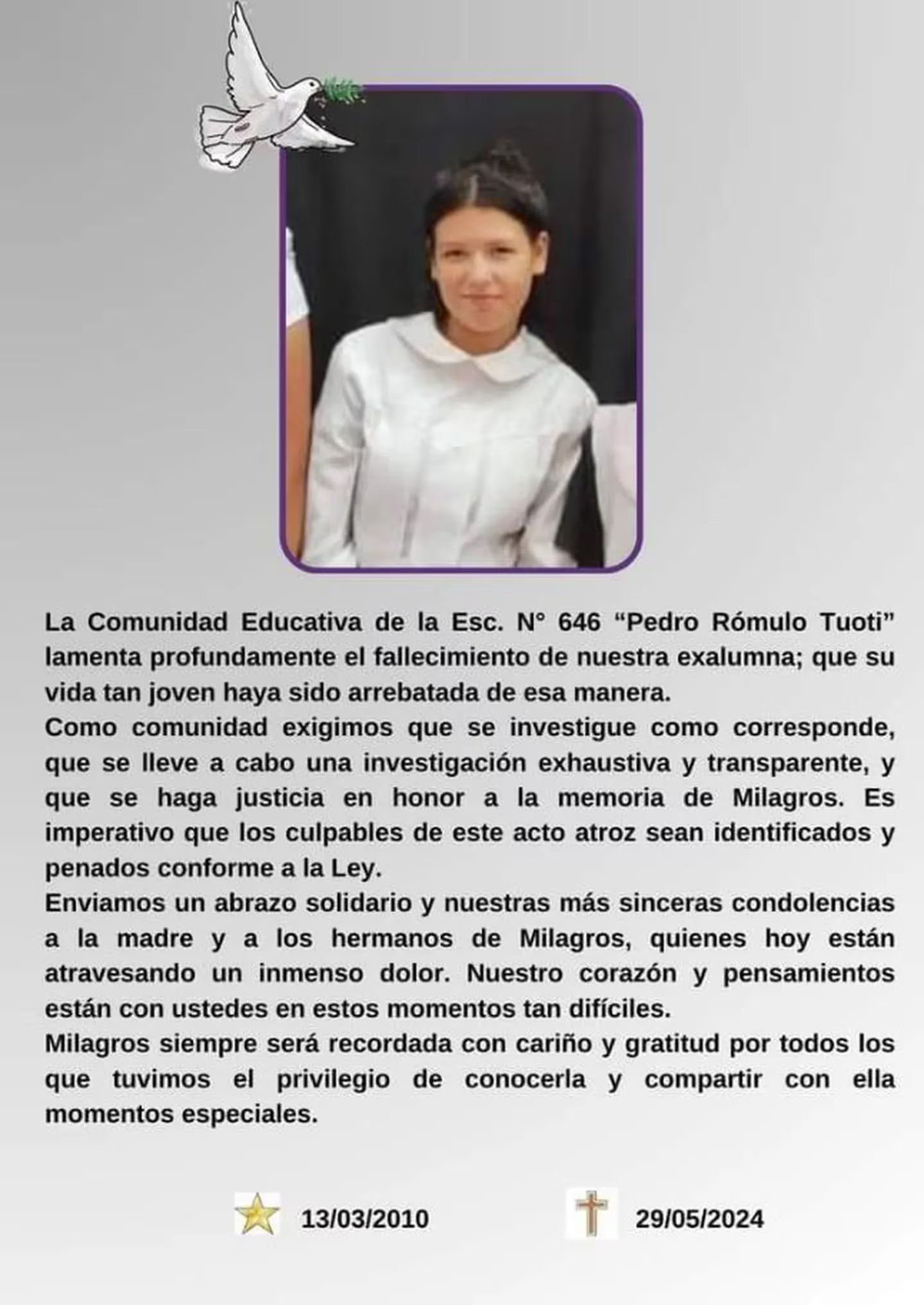 La autopsia, revela que la víctima fue abusada sexualmente y asesinada de una puñalada. Milagros Espinoza había desaparecido el martes a la noche y no se sabia nada.