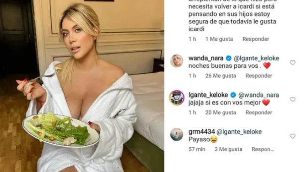 Ahora, la empresaria se la jugó con una sensual foto desde su habitación y el cantante le dejó un pícaro comentario. En la postal se la puede ver a la empresaria sentada con una bata de color blanco comiendo una lechuga, por ende, el interprete no ocultó su atracción por ella y la invitó a pasar una noche con el. “Buenas noches para vos”, le dijo la mediática, y él le retrucó picante: “Si es con vos, mejor”.