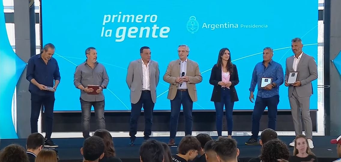 En el acto, el jefe de Estado y el intendente local entregaron medallas recordatorias a los ex integrantes del seleccionado de fútbol del 86, Héctor Enrique, Sergio Goicochea, Carlos Tapia y Sergio Batista, quienes presenciaban la ceremonia desde las plateas de la primera fila.